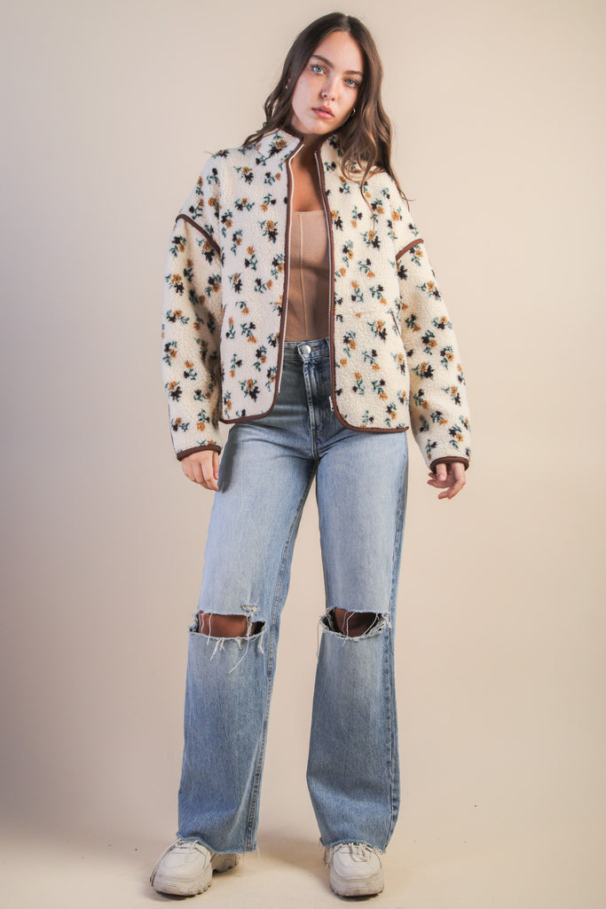 - Oversized Floral Printed Casual Fleece Jacket- High Neck- Front Zip UP- Long Sleeve- Drop Shoulder- Side Pockets