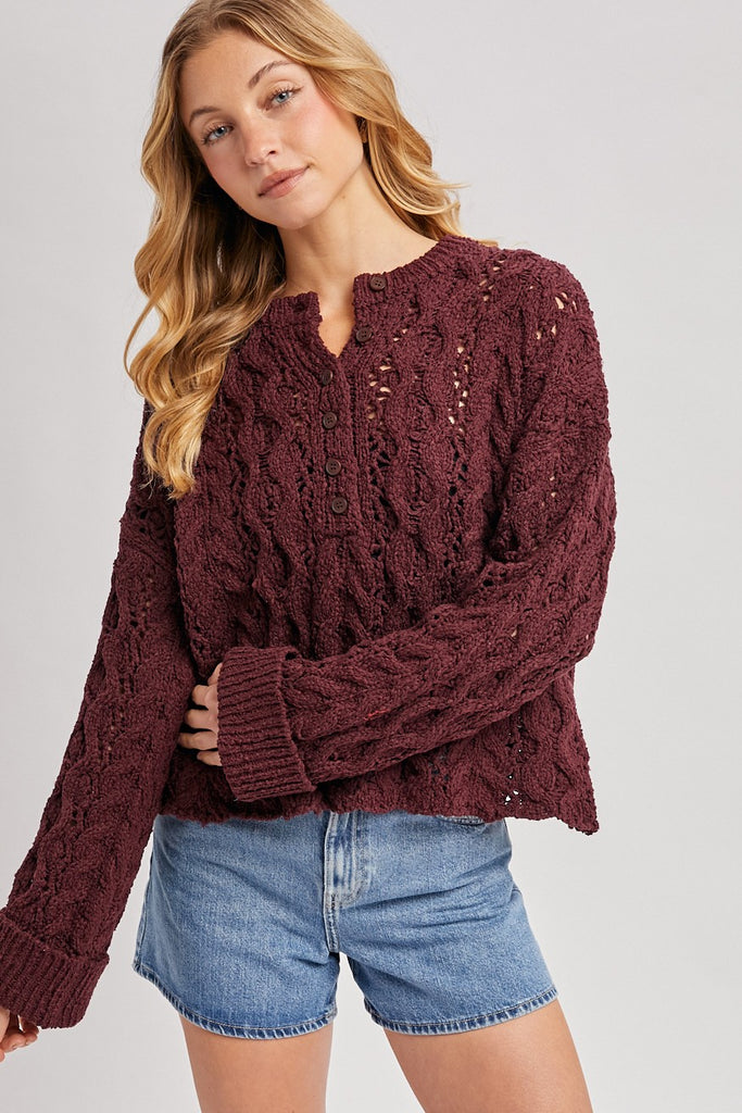 A chunky cable knit and wide bell sleeves make this cardigan a total cozy staple.