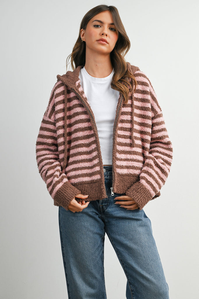 Stay cozy and stylish with our Striped Zip-Up Hooded Cardigan. Featuring a bold stripe pattern and an easy zip closure, this cardigan is perfect for layering on cooler days.