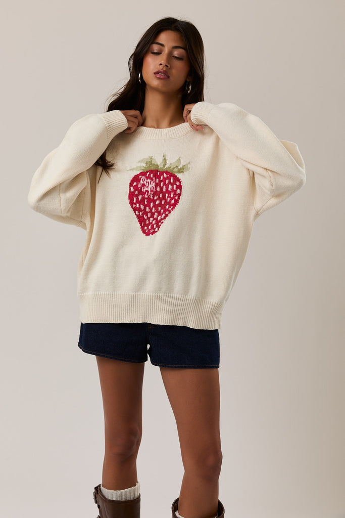 The Berry Sweet Sweater adds a playful touch to your everyday wardrobe. This cream knit sweater features a bold strawberry graphic, a classic crew neckline, and a relaxed fit that’s easy to style. Pair it with denim shorts or jeans for an effortless casual look.