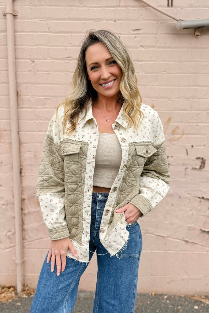 - Oversized Floral Printed Contrast Cotton Jacket- Button Down- Front Patch Pockets- Drop Shoulder- Long Sleeve- Round Raw Edge Hem