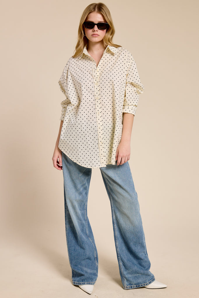 This classic polka dot shirt brings a timeless charm with a modern twist. Made from a smooth woven fabric, it features a relaxed oversized silhouette, collared neckline, and full button down front. Designed with long sleeves, drop shoulders, and curved hem for an effortlessly chic look that pairs well with denim or skirts.